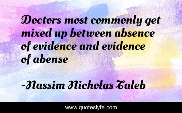 This page presents the quote "Doctors most commonly get mixed up between absence of evidence and evidence of abense". Author of this quote is Nassim Nicholas Taleb. This quote is about medicine, absence, quip, wordplay, evidence,.