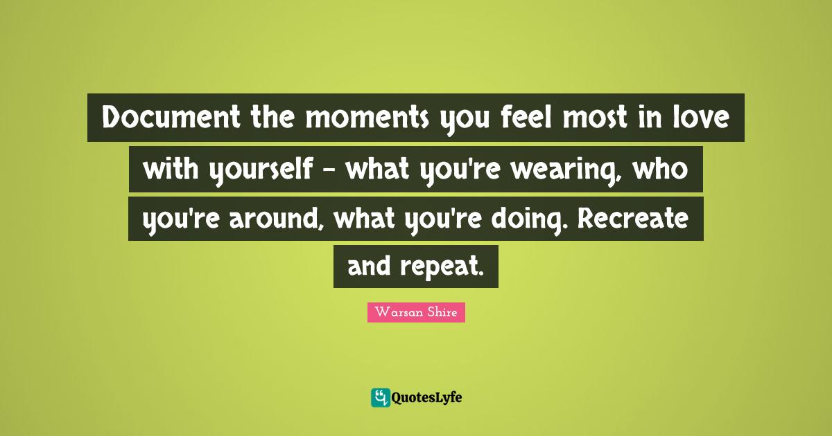This page presents the quote "Document the moments you feel most in love with yourself - what you're wearing, who you're around, what you're doing. Recreate and repeat.". Author of this quote is Warsan Shire. This quote is about love, love you, moments, feels,.