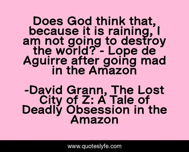 This page presents the quote "Does God think that, because it is raining, I am not going to destroy the world? - Lope de Aguirre after going mad in the Amazon". Author of this quote is David Grann, The Lost City of Z: A Tale of Deadly Obsession in the Amazon. This quote is about anger, faithfulness, amazon, madness, rain,.