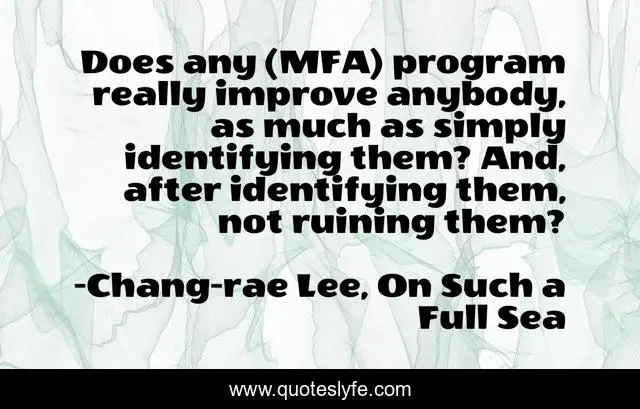 This page presents the quote "Does any (MFA) program really improve anybody, as much as simply identifying them? And, after identifying them, not ruining them?". Author of this quote is Chang-rae Lee, On Such a Full Sea. This quote is about creative-writing, mfa-programs, writing-craft, identity,.