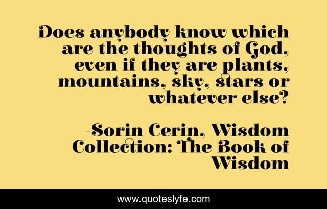 This page presents the quote "Does anybody know which are the thoughts of God, even if they are plants, mountains, sky, stars or whatever else?". Author of this quote is Sorin Cerin, Wisdom Collection: The Book of Wisdom. This quote is about god, life, death, illusion, world,.