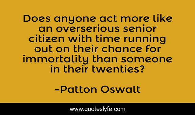This page presents the quote "Does anyone act more like an overserious senior citizen with time running out on their chance for immortality than someone in their twenties?". Author of this quote is Patton Oswalt. This quote is about youth, naivete, age,.