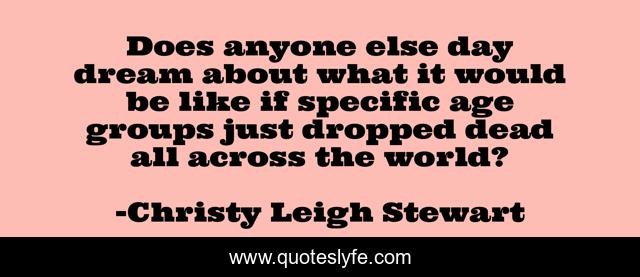 This page presents the quote "Does anyone else day dream about what it would be like if specific age groups just dropped dead all across the world?". Author of this quote is Christy Leigh Stewart. This quote is about generation, funny-and-random, death, question,.