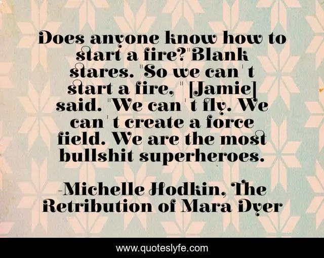 This page presents the quote "Does anyone know how to start a fire?"Blank stares. "So we can't start a fire, " [Jamie] said. "We can't fly. We can't create a force field. We are the most bullshit superheroes.". Author of this quote is Michelle Hodkin, The Retribution of Mara Dyer. This quote is about ya, jamie-roth, retribution-of-mara-dyer, mara-dyer,.