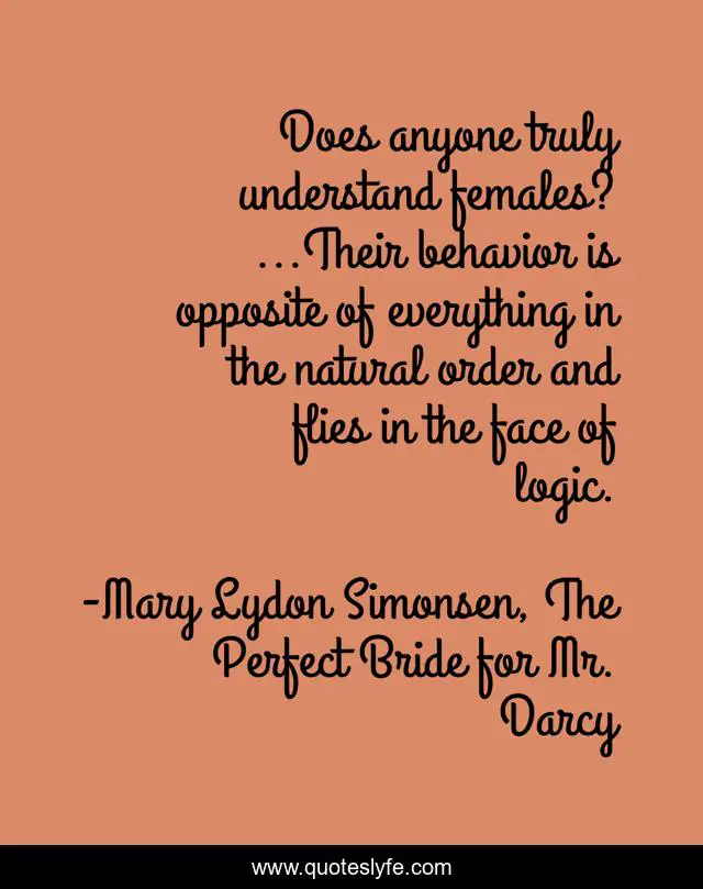 This page presents the quote "Does anyone truly understand females? ...Their behavior is opposite of everything in the natural order and flies in the face of logic.". Author of this quote is Mary Lydon Simonsen, The Perfect Bride for Mr. Darcy. This quote is about mr-darcy, females, behavior, lydon, simonsen, human, mary, women,.