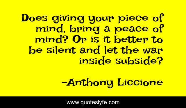 This page presents the quote "Does giving your piece of mind, bring a peace of mind? Or is it better to be silent and let the war inside subside?". Author of this quote is Anthony Liccione. This quote is about piece-of-mind, rag, whitewash, mind, accept, foot-in-mouth, debate, row, peace,.