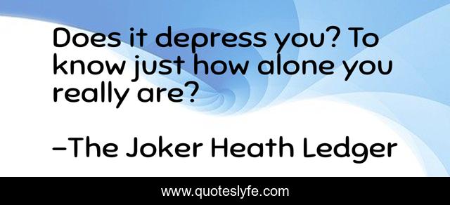 This page presents the quote "Does it depress you? To know just how alone you really are?". Author of this quote is The Joker Heath Ledger. This quote is about alone, depress, heath-ledger, the-joker, the-dark-knight,.