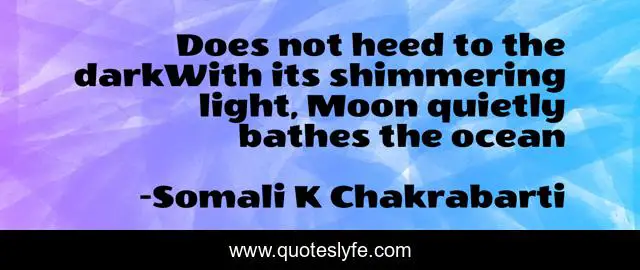 This page presents the quote "Does not heed to the darkWith its shimmering light, Moon quietly bathes the ocean". Author of this quote is Somali K Chakrabarti. This quote is about inspirational-attitude, poetry, nature,.