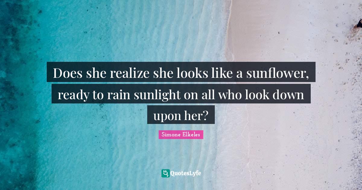 This page presents the quote "Does she realize she looks like a sunflower, ready to rain sunlight on all who look down upon her?". Author of this quote is Simone Elkeles. This quote is about sunflower, rain, ready, sunlight, doe, looks,.