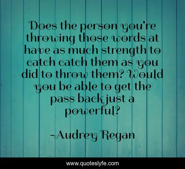 This page presents the quote "Does the person you're throwing those words at have as much strength to catch catch them as you did to throw them? Would you be able to get the pass back just a powerful?". Author of this quote is Audrey Regan. This quote is about life-lesson, quote, think-about-it, be-kind, words-hurt,.