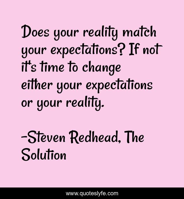 This page presents the quote "Does your reality match your expectations? If not it's time to change either your expectations or your reality.". Author of this quote is Steven Redhead, The Solution. This quote is about reality, expectations, change, time,.