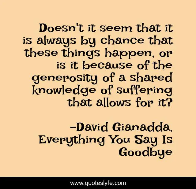 This page presents the quote "Doesn't it seem that it is always by chance that these things happen, or is it because of the generosity of a shared knowledge of suffering that allows for it?". Author of this quote is David Gianadda, Everything You Say Is Goodbye. This quote is about suffering-of-humanity, suffering, war,.