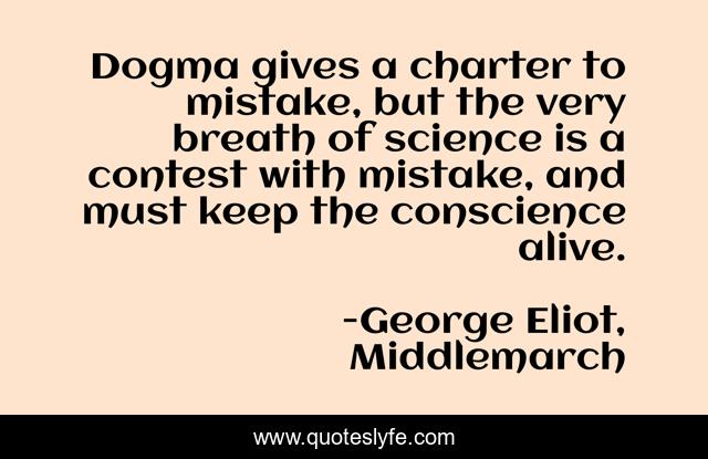 This page presents the quote "Dogma gives a charter to mistake, but the very breath of science is a contest with mistake, and must keep the conscience alive.". Author of this quote is George Eliot, Middlemarch. This quote is about conscience, dogma, mistake, science,.