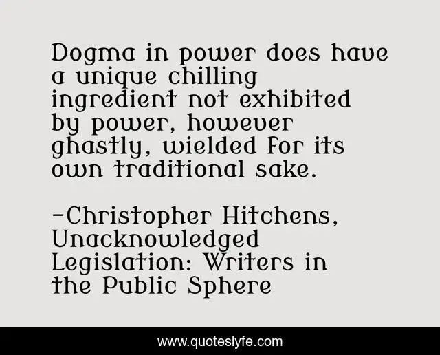 "Christopher Hitchens, Unacknowledged Legislation: Writers in the Public Sphere Quotes." Quoteslyfe.com, 2025. Sat. 06 Dec. 2025. <https://www.quoteslyfe.com/quote/Dogma-in-power-does-have-a-unique-56821>.