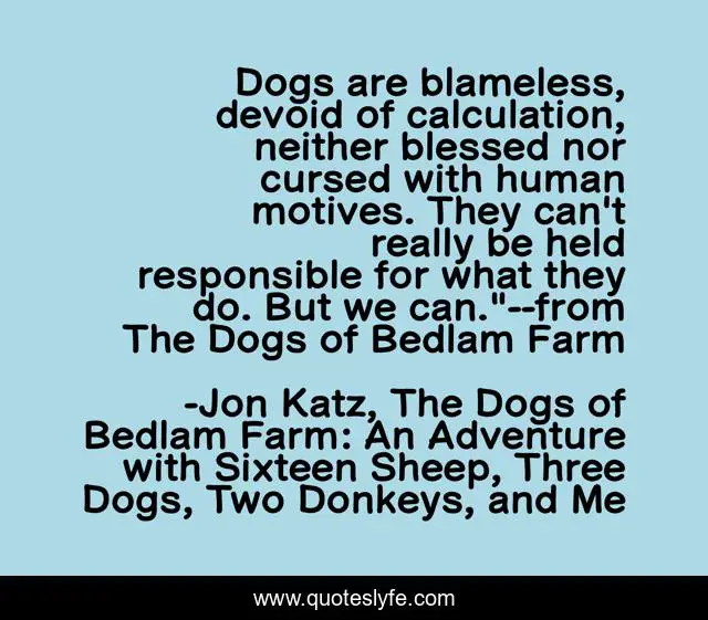This page presents the quote "Dogs are blameless, devoid of calculation, neither blessed nor cursed with human motives. They can't really be held responsible for what they do. But we can."--from The Dogs of Bedlam Farm". Author of this quote is Jon Katz, The Dogs of Bedlam Farm: An Adventure with Sixteen Sheep, Three Dogs, Two Donkeys, and Me. This quote is about dogs, love-of-dogs, dogs-and-humans,.