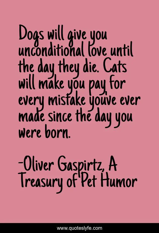 This page presents the quote "Dogs will give you unconditional love until the day they die. Cats will make you pay for every mistake you've ever made since the day you were born.". Author of this quote is Oliver Gaspirtz, A Treasury of Pet Humor. This quote is about love, unconditional-love, dogs-vs-cats, mistakes, pets, death-and-love, cats, dogs, affection,.