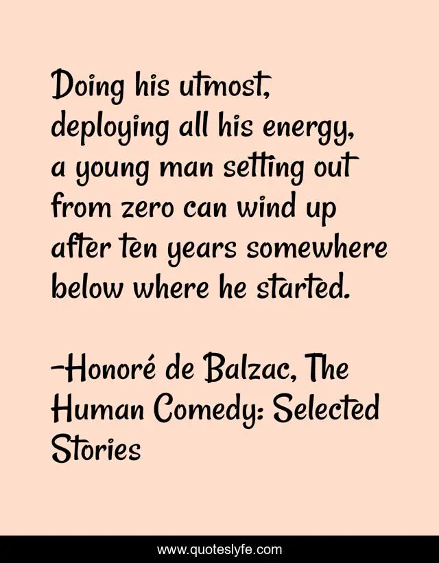 This page presents the quote "Doing his utmost, deploying all his energy, a young man setting out from zero can wind up after ten years somewhere below where he started.". Author of this quote is Honoré de Balzac, The Human Comedy: Selected Stories. This quote is about career, future, z-marcas,.