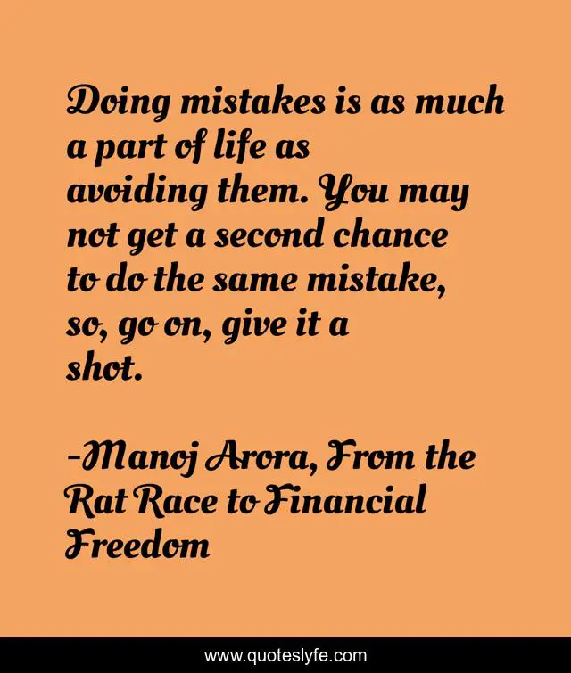 This page presents the quote "Doing mistakes is as much a part of life as avoiding them. You may not get a second chance to do the same mistake, so, go on, give it a shot.". Author of this quote is Manoj Arora, From the Rat Race to Financial Freedom. This quote is about give-it-a-try, avoiding, life, mistakes,.