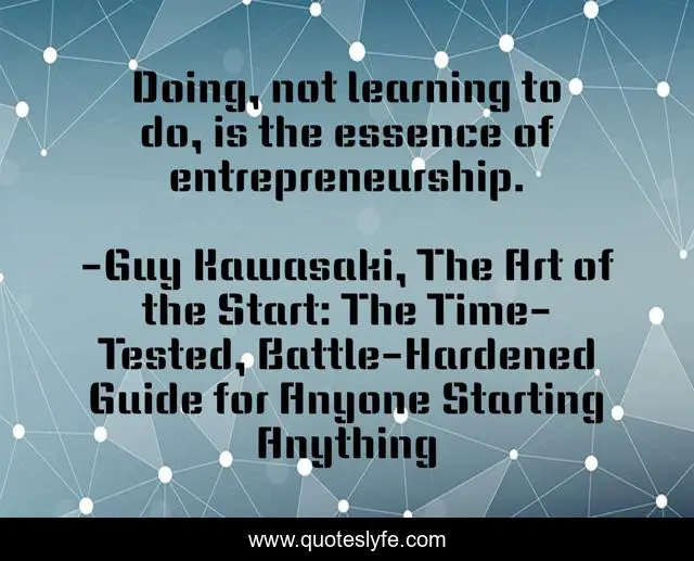 This page presents the quote "Doing, not learning to do, is the essence of entrepreneurship.". Author of this quote is Guy Kawasaki, The Art of the Start: The Time-Tested, Battle-Hardened Guide for Anyone Starting Anything. This quote is about motivation, entrepreneurship, inspiration,.