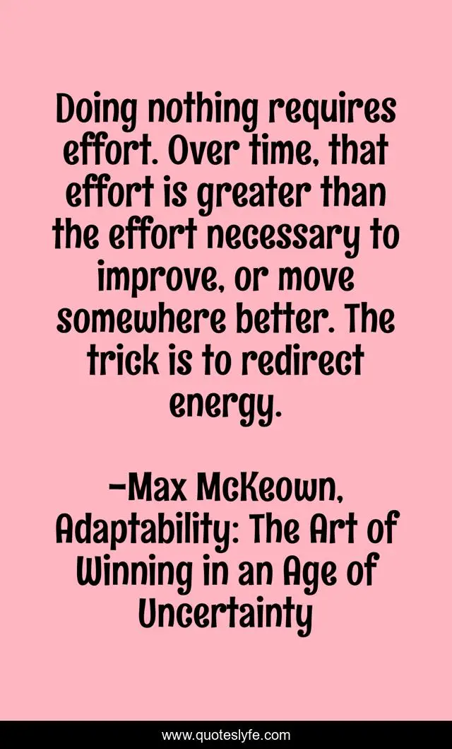 This page presents the quote "Doing nothing requires effort. Over time, that effort is greater than the effort necessary to improve, or move somewhere better. The trick is to redirect energy.". Author of this quote is Max McKeown, Adaptability: The Art of Winning in an Age of Uncertainty. This quote is about improvement, leadership, inertia, change, strategy,.