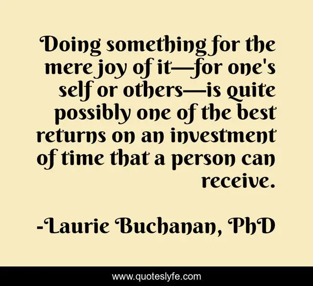 This page presents the quote "Doing something for the mere joy of it—for one's self or others—is quite possibly one of the best returns on an investment of time that a person can receive.". Author of this quote is Laurie Buchanan, PhD. This quote is about joy, return-on-investment, note-to-self, investment-of-time, roi,.
