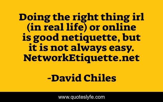 This page presents the quote "Doing the right thing irl (in real life) or online is good netiquette, but it is not always easy. NetworkEtiquette.net". Author of this quote is David Chiles. This quote is about etiquette, right, web, internet-etiquette, internet, in-real-llife, netiquette, wrong, irl,.