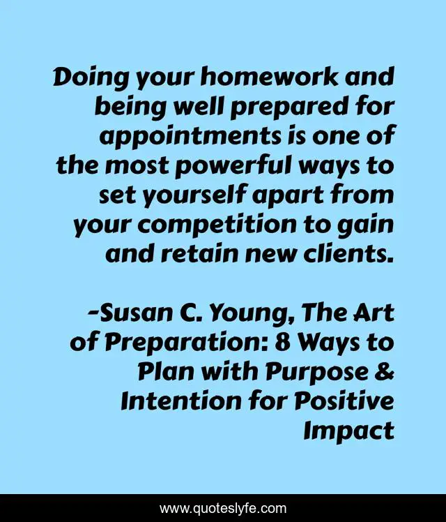 "Susan C. Young, The Art of Preparation: 8 Ways to Plan with Purpose & Intention for Positive Impact Quotes." Quoteslyfe.com, 2025. Fri. 05 Dec. 2025. <https://www.quoteslyfe.com/quote/Doing-your-homework-and-being-well-prepared-227495>.