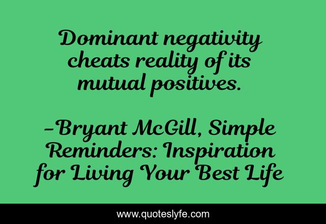 This page presents the quote "Dominant negativity cheats reality of its mutual positives.". Author of this quote is Bryant McGill, Simple Reminders: Inspiration for Living Your Best Life. This quote is about positivity, cheating, dominance, negativity, reality,.