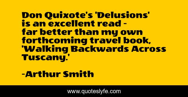 This page presents the quote "Don Quixote's 'Delusions' is an excellent read - far better than my own forthcoming travel book, 'Walking Backwards Across Tuscany.'". Author of this quote is Arthur Smith. This quote is about better, walking, book,.