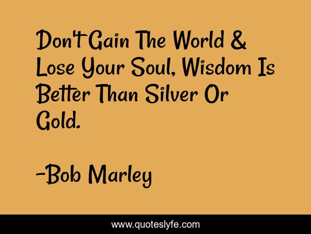 This page presents the quote "Don't Gain The World & Lose Your Soul, Wisdom Is Better Than Silver Or Gold.". Author of this quote is Bob Marley. This quote is about peace, wealth, soul, wisdom,.