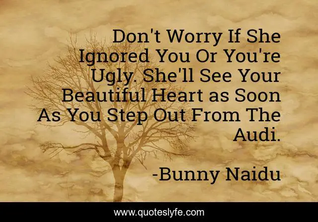 This page presents the quote "Don't Worry If She Ignored You Or You're Ugly. She'll See Your Beautiful Heart as Soon As You Step Out From The Audi.". Author of this quote is Bunny Naidu. This quote is about wise, bunny-naidu, love-qoutes, wise-sayings, bunny-sayings, ugly, beautiful-heart,.