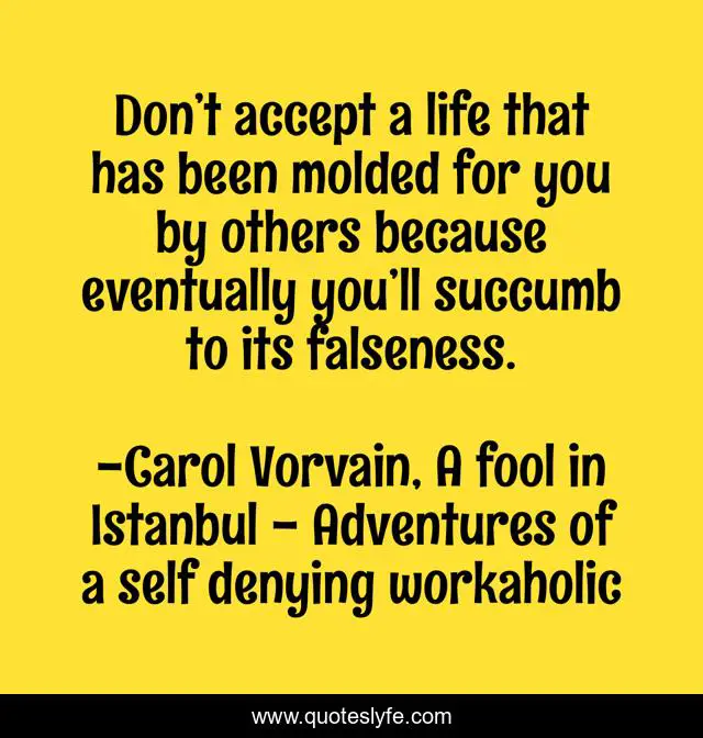 This page presents the quote "Don’t accept a life that has been molded for you by others because eventually you’ll succumb to its falseness.". Author of this quote is Carol Vorvain, A fool in Istanbul - Adventures of a self denying workaholic. This quote is about workaholic, life-lessons,.