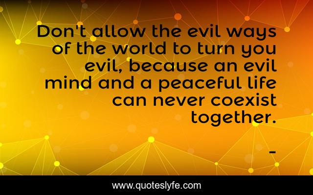 This page presents the quote "Don't allow the evil ways of the world to turn you evil, because an evil mind and a peaceful life can never coexist together.". Author of this quote is . This quote is about an-evil-mind, coexisting-together, coexist, edmond-mbiaka, a-peaceful-life, evil-ways-of-the-world,.