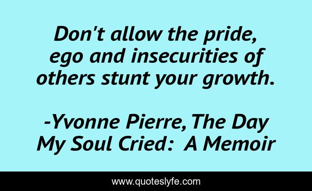 This page presents the quote "Don't allow the pride, ego and insecurities of others stunt your growth.". Author of this quote is Yvonne Pierre, The Day My Soul Cried: A Memoir. This quote is about inspiring, wellness, insecurities, growth, ego, inspirational, enthusiasm, pride,.