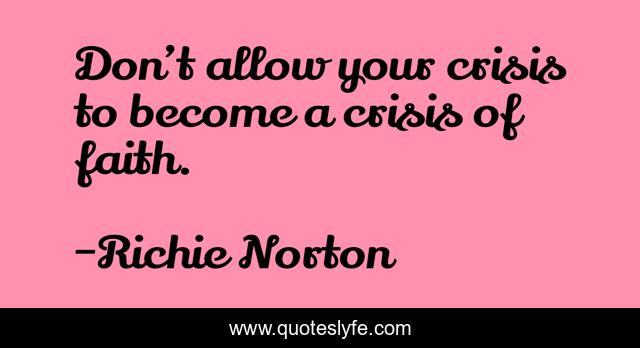 This page presents the quote "Don’t allow your crisis to become a crisis of faith.". Author of this quote is Richie Norton. This quote is about faith, belief, allow, believe, crisis, hope,.