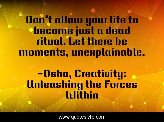 This page presents the quote "Don’t allow your life to become just a dead ritual. Let there be moments, unexplainable.". Author of this quote is Osho, Creativity: Unleashing the Forces Within. This quote is about moments, life, ritual, unexplainable,.