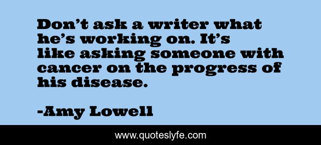 This page presents the quote "Don’t ask a writer what he’s working on. It’s like asking someone with cancer on the progress of his disease.". Author of this quote is Amy Lowell. This quote is about amy, progress, writer, work,.