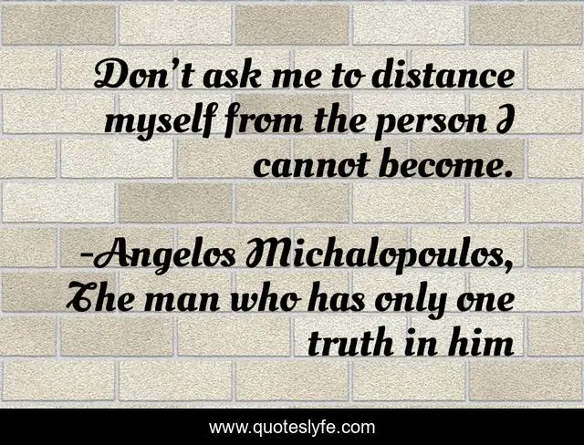 This page presents the quote "Don’t ask me to distance myself from the person I cannot become.". Author of this quote is Angelos Michalopoulos, The man who has only one truth in him. This quote is about romance, spiritual, self-improvement,.