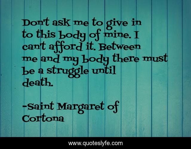 This page presents the quote "Don't ask me to give in to this body of mine. I can't afford it. Between me and my body there must be a struggle until death.". Author of this quote is Saint Margaret of Cortona. This quote is about commitment, belief,.