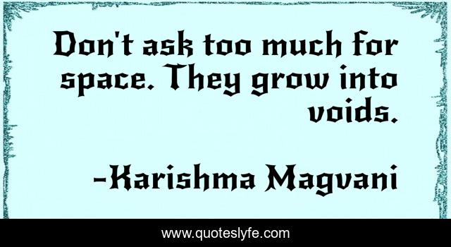 This page presents the quote "Don't ask too much for space. They grow into voids.". Author of this quote is Karishma Magvani. This quote is about relationships, life, space, void, relations, experiences, life-lessons, relationships-101, relationships-advice,.