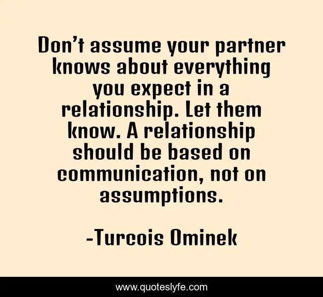 This page presents the quote "Don’t assume your partner knows about everything you expect in a relationship. Let them know. A relationship should be based on communication, not on assumptions.". Author of this quote is Turcois Ominek. This quote is about relationships, love, assume, relationship-advice, expectations, communications, truth, affection,.