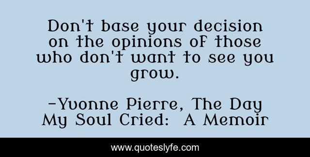 This page presents the quote "Don't base your decision on the opinions of those who don't want to see you grow.". Author of this quote is Yvonne Pierre, The Day My Soul Cried: A Memoir. This quote is about live-your-life, critism, personal-growth, critics, self-worth, growth, the-opinions-of-others,.