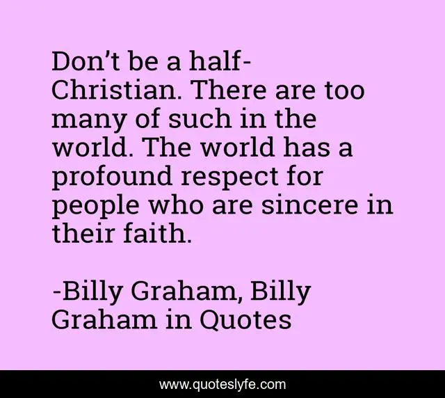 This page presents the quote "Don’t be a half-Christian. There are too many of such in the world. The world has a profound respect for people who are sincere in their faith.". Author of this quote is Billy Graham, Billy Graham in Quotes. This quote is about billy-graham, christianity,.