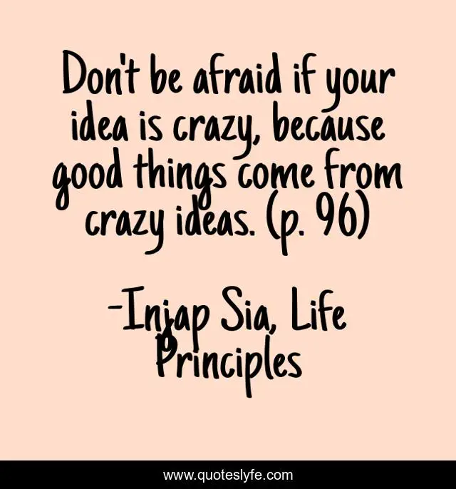 This page presents the quote "Don't be afraid if your idea is crazy, because good things come from crazy ideas. (p. 96)". Author of this quote is Injap Sia, Life Principles. This quote is about business, life-principles, dreams, success, ideas,.