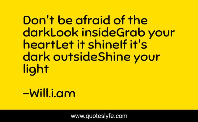 This page presents the quote "Don't be afraid of the darkLook insideGrab your heartLet it shineIf it's dark outsideShine your light". Author of this quote is Will.i.am. This quote is about shine, heart, lyrics, song, songwriter, light, dark, fear, will-i-am,.