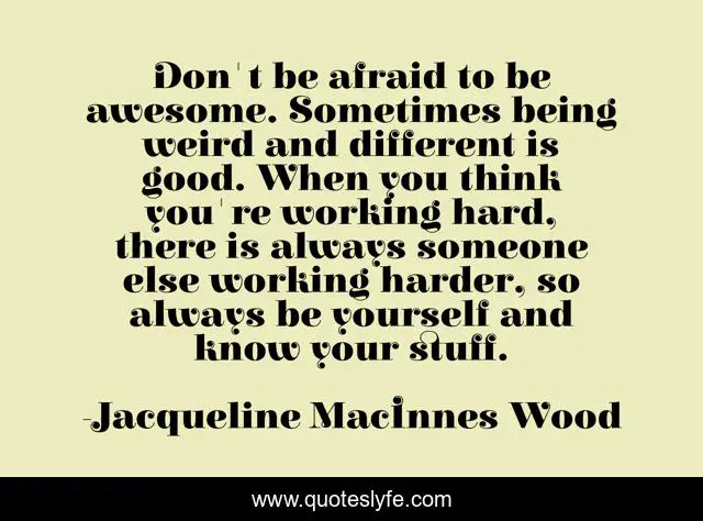This page presents the quote "Don't be afraid to be awesome. Sometimes being weird and different is good. When you think you're working hard, there is always someone else working harder, so always be yourself and know your stuff.". Author of this quote is Jacqueline MacInnes Wood. This quote is about working hard, be yourself,.