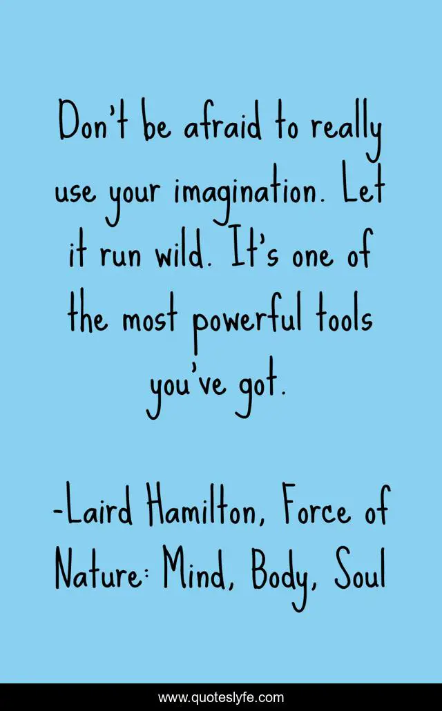 This page presents the quote "Don’t be afraid to really use your imagination. Let it run wild. It’s one of the most powerful tools you’ve got.". Author of this quote is Laird Hamilton, Force of Nature: Mind, Body, Soul. This quote is about imagination, tools, power,.