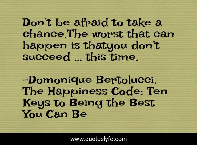 This page presents the quote "Don’t be afraid to take a chance.The worst that can happen is thatyou don’t succeed … this time.". Author of this quote is Domonique Bertolucci, The Happiness Code: Ten Keys to Being the Best You Can Be. This quote is about life-coaching, motivation, how-to-be-happier, life-coach, be-happy, how-to-be-happy, happiness-advice, happiness, be-more-motivated,.