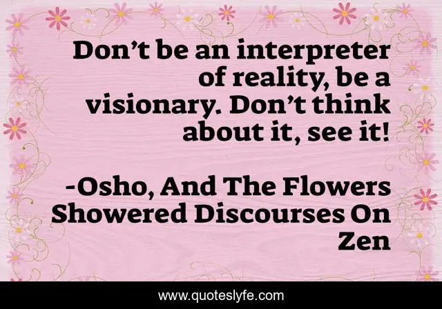 This page presents the quote "Don’t be an interpreter of reality, be a visionary. Don’t think about it, see it!". Author of this quote is Osho, And The Flowers Showered Discourses On Zen. This quote is about seeing, visionary, reality,.