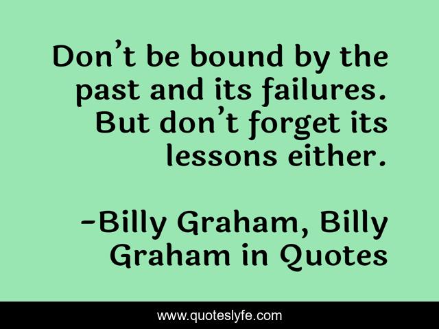 This page presents the quote "Don’t be bound by the past and its failures. But don’t forget its lessons either.". Author of this quote is Billy Graham, Billy Graham in Quotes. This quote is about disappointment, billy-graham,.